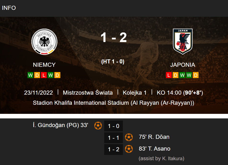 Druga połowa była wciąż dla Niemców, ale gdy zostały zrobione zmiany w Japonii, to Japończycy zaczęli atakować raz za razem i bałem się, że nic nie wleci, ale w końcu udało się po dobitce, a potem 3-4 minuty potem samotny rajd Asano i nwm jak on to zmieścił pod tak ostrym kątem i to też na takim bramkarzu jakim jest Manuel Neuer