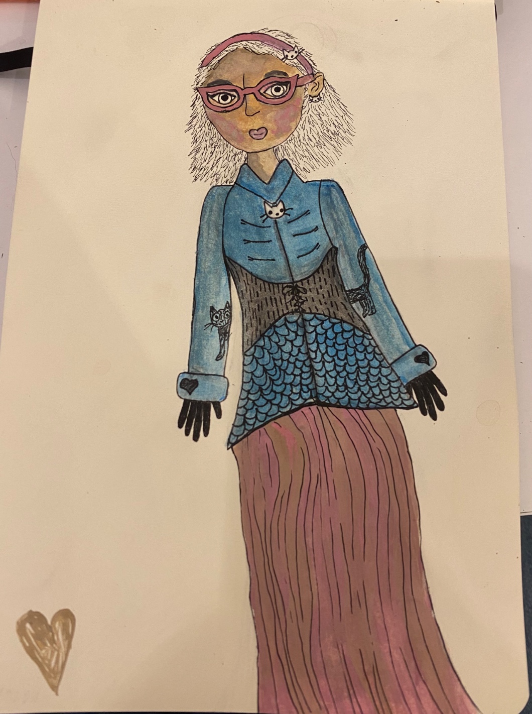 11. Jeśli masz książkę na biurku, niech Twoja postać ma spięte włosy (lub opaskę na włosach, jeśli włosy są krótkie). Jeśli na Twoim biurku stoi komputer stacjonarny, narysuj postaci słuchawki. Jeśli trzymasz na biurku laptopa – narysuj jej kolczyki.