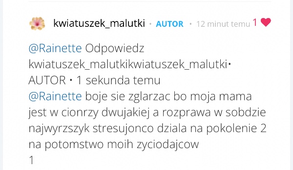 Odpowiedz kwiatuszek_malutkikwiatuszek_malutki• AUTOR • 1 sekunda temu @Rainette boje sie zglarzac bo moja mama jest w cionrzy dwujakiej a rozprawa w sobdzie najwyrzszyk stresujonco dziala na pokol