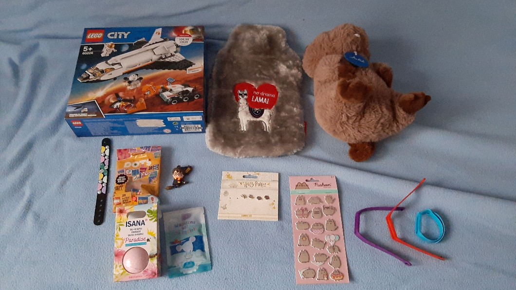 @Octo może ja po prostu wstawię zdjęcie i opis⬇️ więc tak będę szła od prawego górnego rogu w prawo😅: lego, ogrzewacz, bóbr (Nie pytaj), lego dots, kolczyki z HP, jakieś rzeczy do kąpieli :p, aha tam był jeszcze pendrajw (Nie wiem jak się pisze xd)z HP, naklejki z pusheenem i tu są akurat tylko opaski, ale dostałam Mi banda czy coś no w każdym razie taki zegarek