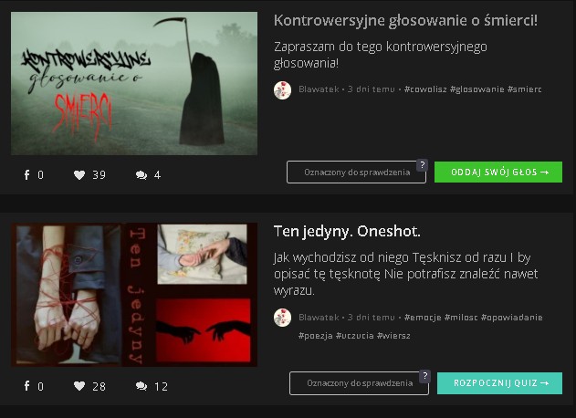 AUTOR•Cześć! Mam dużo nauki i gorsze samopoczucie przez schodzenie z leków, dlatego w weekend pojawi się tylko wiersz. No i, nie wiem kiedy zajmę się ocenianiem profili. Myślę, że zacznę w przyszłym tygodniu.
