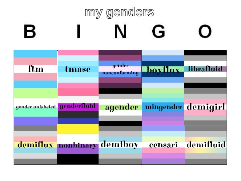 Także zrobiłem bingo z wszystkimi tożsamościami płciowymi które miałem kiedykolwiek (nie po kolei bo nie chciało mi się aż tak bardzo zagłębiać w mój lore)