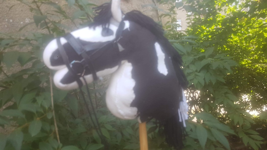 • AUTOR@.Emisia. Wycięłam szablon na A3, wycięłam dwie części polaru według tego szablonu, oraz dwa długie (szerokie na 8 cm) pasy, biały i czarny, i zszyłam je ze sobą, a następnie zszyłam razem z resztą w jedną całość. Podoszywałam łaty, uszy i całą reszte, wypchałam, zrobiłam grzywę i doczepiłam kija