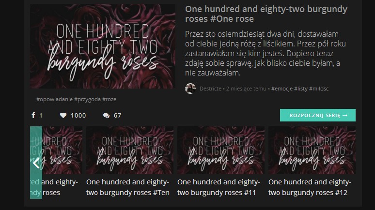 AUTOR•Pod „One hundred and eighty two burgundy roses” stuknął nam tysiak! A pod NIN no cóż, dodałam tylko jedną część w tym długim okresie przerwy przy tej serii i mamy już ponad 5 tys serc. Co do OHAETBR chyba z okazji tej pięknej liczby wpadną trzy różyczki 😉🌹