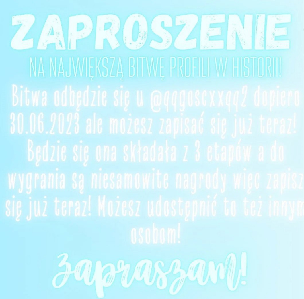 Zaproszenie na największą bitwę profili w historii. Bitwa odbędzie się u @qqgoscxxqq2 dopireo 30.06.2023 ale możesz się zapisać już teraz! – I tam dalej co o etapach.