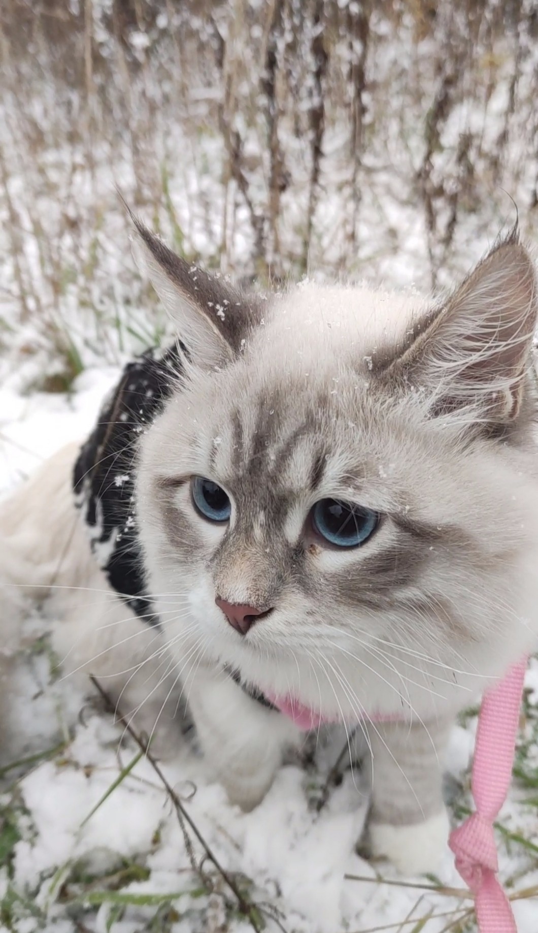 AUTOR•Dzisiaj jest o wiele więcej śniegu niż wczoraj! Przeszliśmy dwa kilometry 🤭. Płatki śniegu tak pięknie spadały mu na pyszczek i lawirowały wokół niego… Śnieg jest wszędzie!