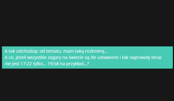 @Shinelly ogólnie rozkmina jest super, ale nie mogę się zgodzić: "godzina" to pojęcie względne, które nie istniałoby w naturze, gdyby ktoś wcześniej na to nie wpadł 👌 Dlatego nie można powiedzieć, że wszystkie zegary są źle ustawione, bo wszystkie chodzą według systemu wymyślonego przez ludzi 😅