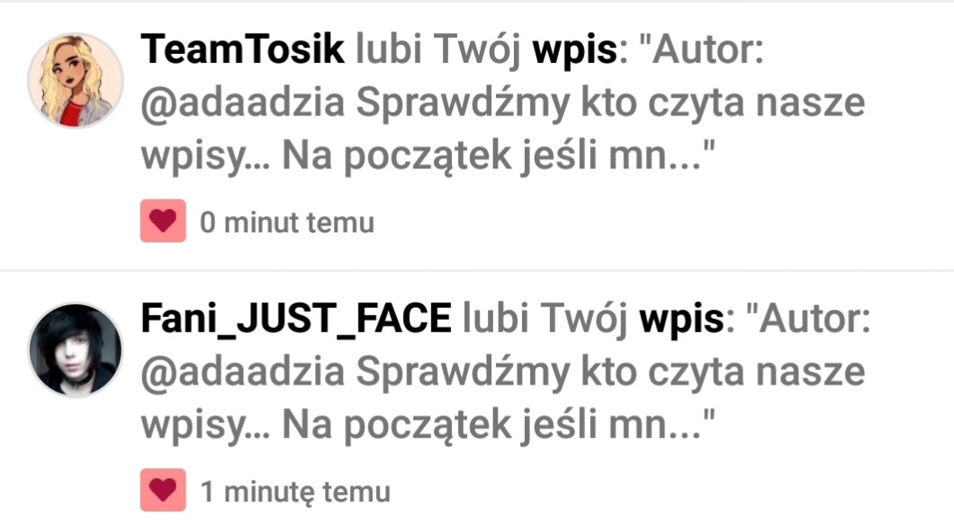 Sprawdźmy kto czyta nasze wpisy… Na początek jeśli mnie lubisz napisz komentarz pod tym wpisem… Dowolny. Jeśli mnie nie lubisz, to polub ten wpis. Ludzie na ślepo polubiają wpisy innych nawet ich nie czytając… Ciekawe, kto z nas ma na tyle wiernych obserwatorów, że czytają uważnie nasze wpisy…? Wklej to na swój profil i dowiedz się, kto czyta twoje wpisy… I nie usuwaj autora!