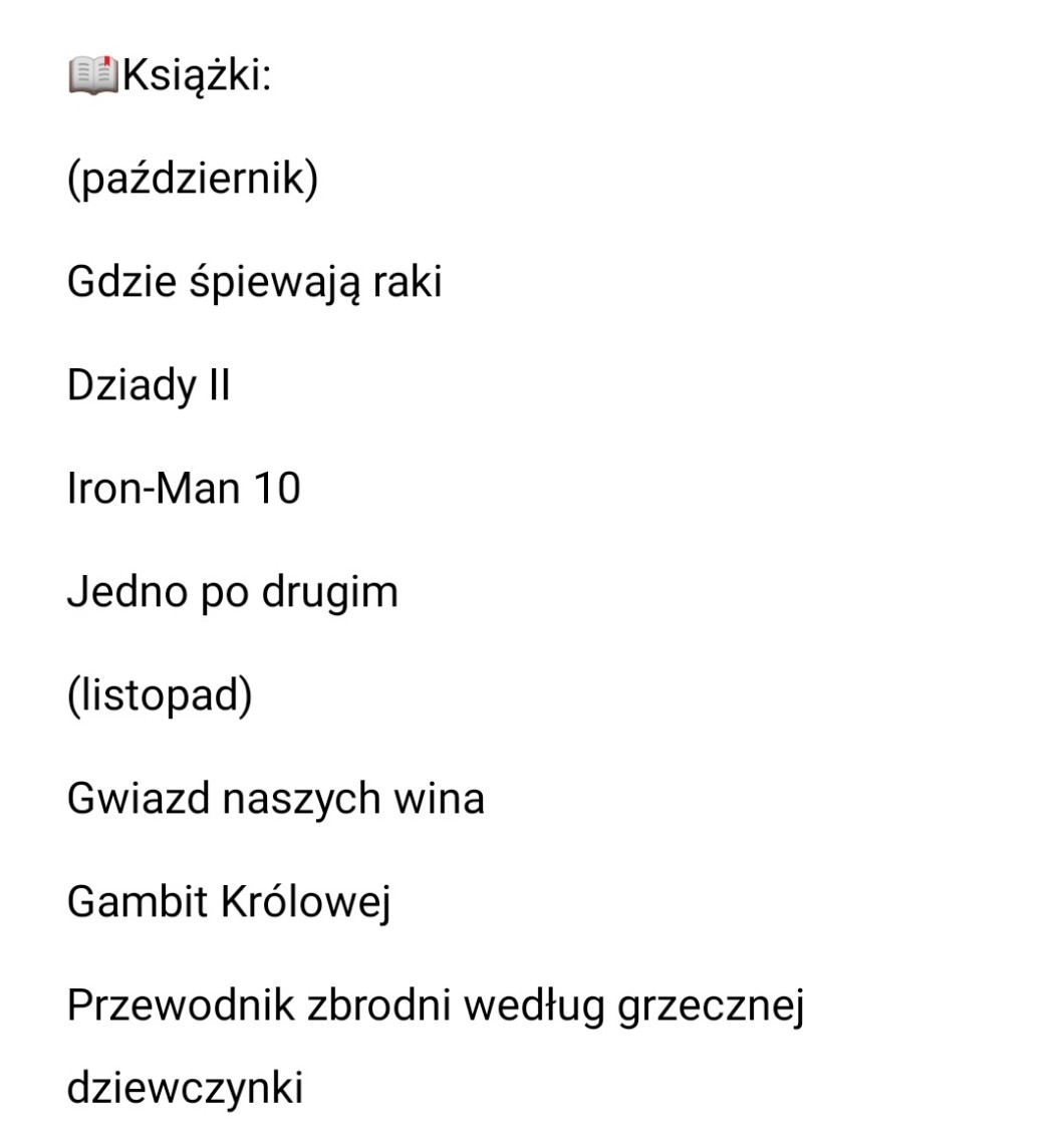 Mi minął dobrze. Byłam z kuzynką na zakupach, z koleżanką się spotkałam. Kupiłam dwa komiksy z Marvela, Avengers 1 i Iron-Man 10 ( to wcale nie tak, że nie czytałam nic innego XDDD ) i Avengers już przeczytałam i mega było <33. Mama mi dzisiaj kupiła taki super jesienny sweterek, więc fajnieee. Obejrzałam też 2 odc Lokiego i też był mega <3. Tańczyliśmy też na dzień nauczyciela. Z ocenami to tam nic ciekawego, w sensie coś tam dostałam, ale noo. W przyszłym tygodniu mam test z ang, fizyki i niemieckiego. I rozprawkę napisać. W ten weekend mam zamiar skończyć dzienniki Alana Rickmana. Potem przeczytać komiks i Gdzie raki śpiewają. Z moich obliczeń wynika, że coś jeszcze dam radę w październiku przeczytać, ale jeszcze nwm co (i Dziady II XD).