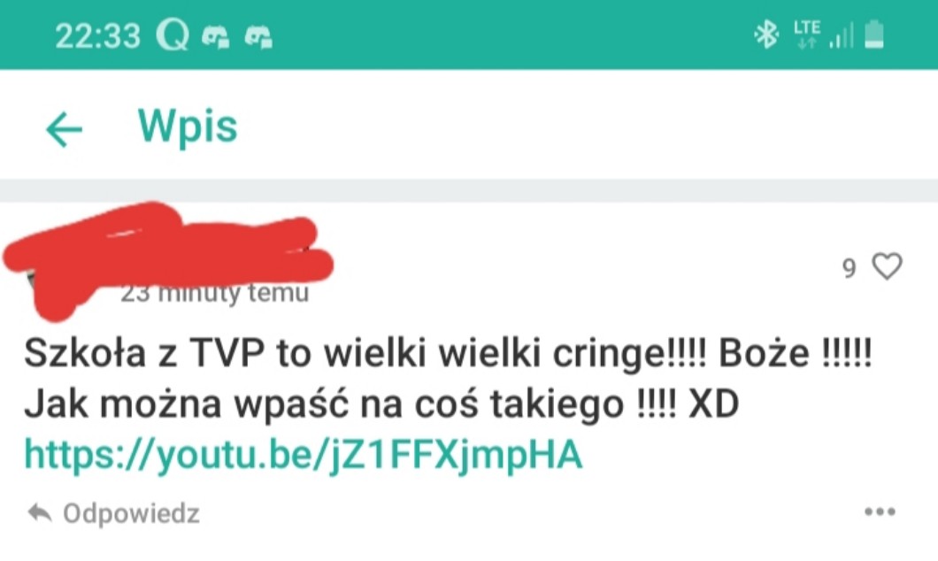 Być może zastanawiacie się, czemu to piszę. Otóż obserwuję pewną, no dosyć popularną osobę. Bądź co bądź ponad 500 obs to całkiem sporo. Na profilu tej osoby pojawił się wpis, którego screena wstawię wam poniżej (jakby co, link jest do jakiegoś „śmiesznego” filmiku pokazującego nauczycielkę ze Szkoły TVP). Moim zdaniem jest to podejście bardzo niewłaściwe, ale najgorsze jes to, że były osoby, które jej PRZYTAKIWAŁY. Kiedy natomiast napisałam odpowiedź, w której tłumaczyłam dlaczego nie ma racji, spotkałam się z oskarżeniem o to, że ją obrażam (co jest nieprawdą. Jeśli chcecie, mogę nawet wysłać w innym wpisie screena tej mojej odpowiedzi). Napisała też, że nauczycielki ze Szkoły TVP poprostu się nie starają. Napisałam kolejną szczegółową odpowiedź, by wyprowadzić ją z błędu, lecz okazało się, że nie mogę jej opublikować. Dlaczego? Ponieważ wpis został usunięty. I o ile jakoś nie płaczę z tego powodu, to cała ta sytuacja serio mnie zaniepokoiła. Proszę was, nie dołączajcie się do linczu na Bogu ducha winnych ludzi! Nie publikujcie na swoich profilach prześmiewczych wpisów, nie przesyłajcie filmików i zwracajcie uwagę osobom, które tak robią. Postarajmy się choć trochę zmniejszyć tę falę hejtu!