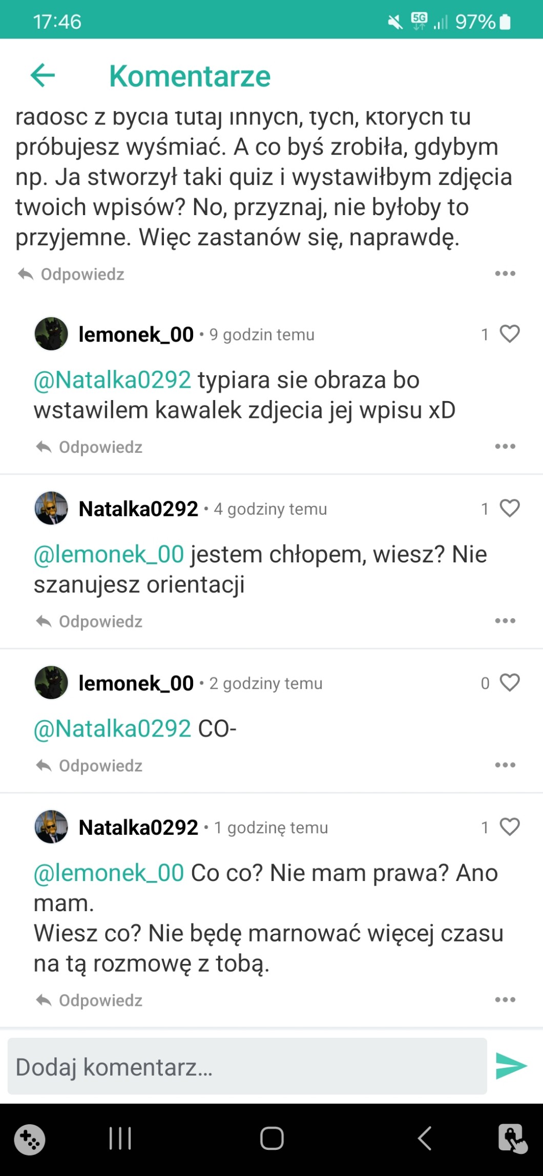 gdyby nie ludzie typu natalka dawno by mnie nie bylo na tej stronie bo byloby za nudno, dziekuje nataliuszu za twoja obecnosc i orientacje ze jestes chlopcem🙏