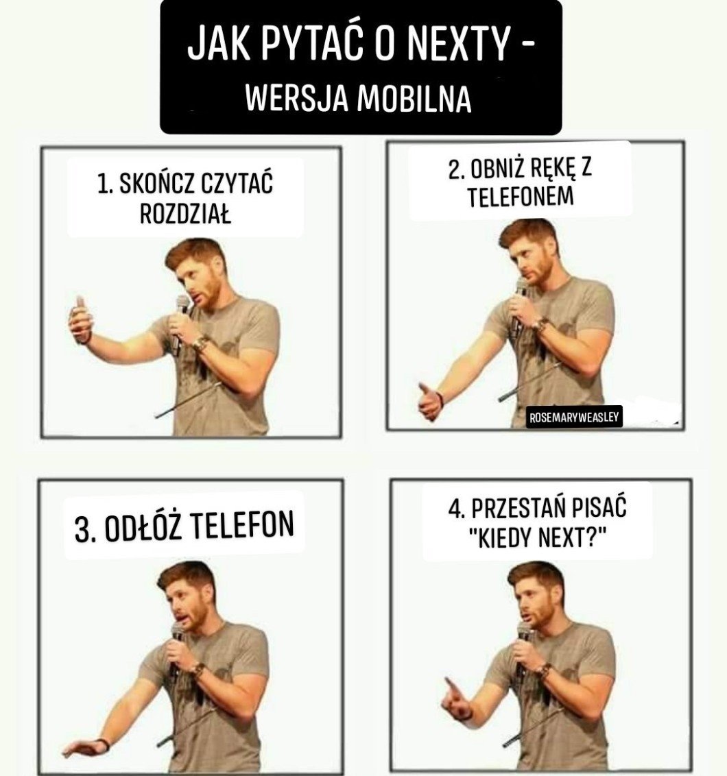 również uprzejmie oznajmiam, że jeśli ktoś napisze mi podczas tego maratonu komentarz typu „daj next”, to dać mu mogę w mordę co najwyżej, bo ja serio doceniam, że podoba się wam to, co piszę, i chcecie więcej, ale może was to zdziwić, że pisanie jakichś romansideł nie jest moją pracą na pełny etat, nikt mi za to nie płaci i nawet nikt mi w tym nie pomaga, więc proszę ładnie o uszanowanie mojej osoby 💁🏾♀️