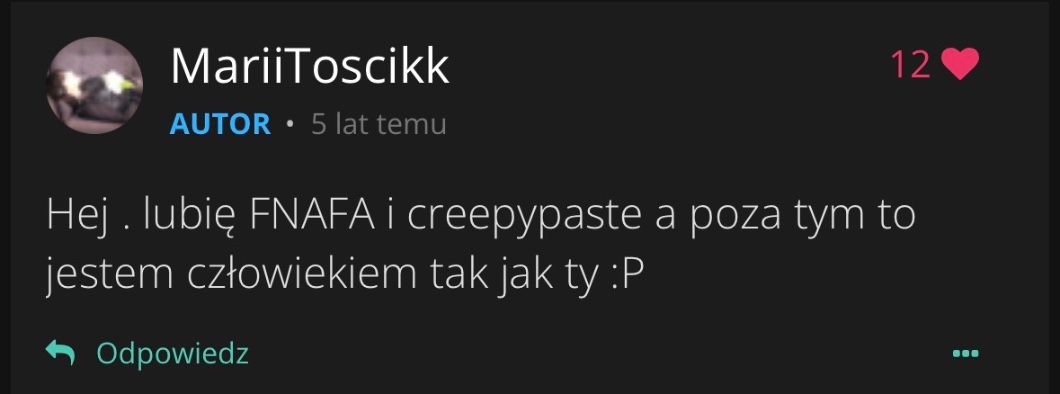 AUTOR•A i chej bo wgl bylam na fnafie!! Ci co byli przy poczatku tego konta (prwnie nje ma takich osob) wiedza ze to mega zajawa byla paroletnia. Tak wiec cieszylam sie jak male dziecko ktore zakladalo tu konto wtedy zeby yappowac o mordercach dzidci i animatronikach