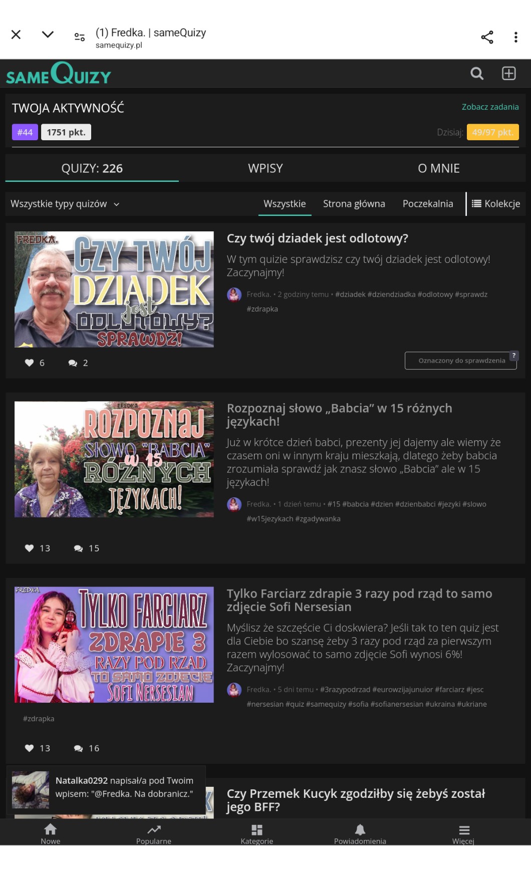 AUTOR•Ej chciałabym wiedzieć kto ma oznaczone quizy np kebab wchodzę na jego profil i widzę 3 miliardy oznaczeń