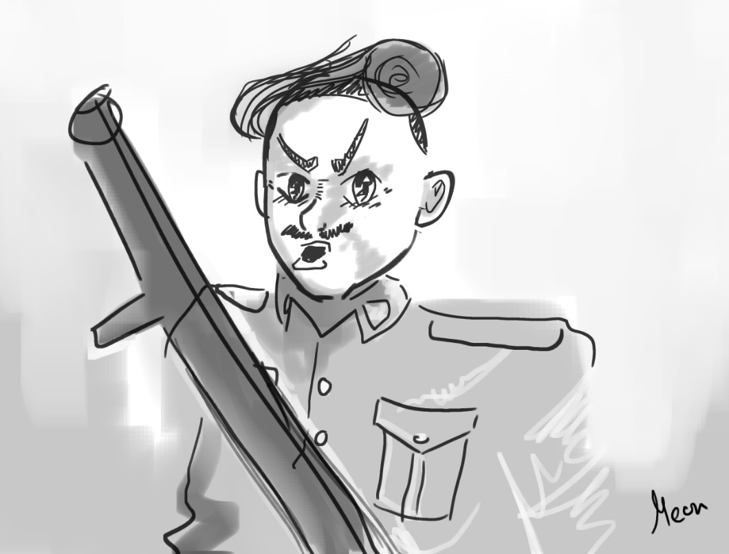 AUTOR•Szybki szkic postaci z mojego opowiadania JoJo’s Bizarre Adventure- Your Tourn! z naciskiem na SZYBKI. Mała ciekawostka na czas oczekiwania 3 części! Tak nie ma rąk….bo mi się nie chciało dorysowywać :D ( to wielkie czarne to karabin….bardzoo uproszczony xd )