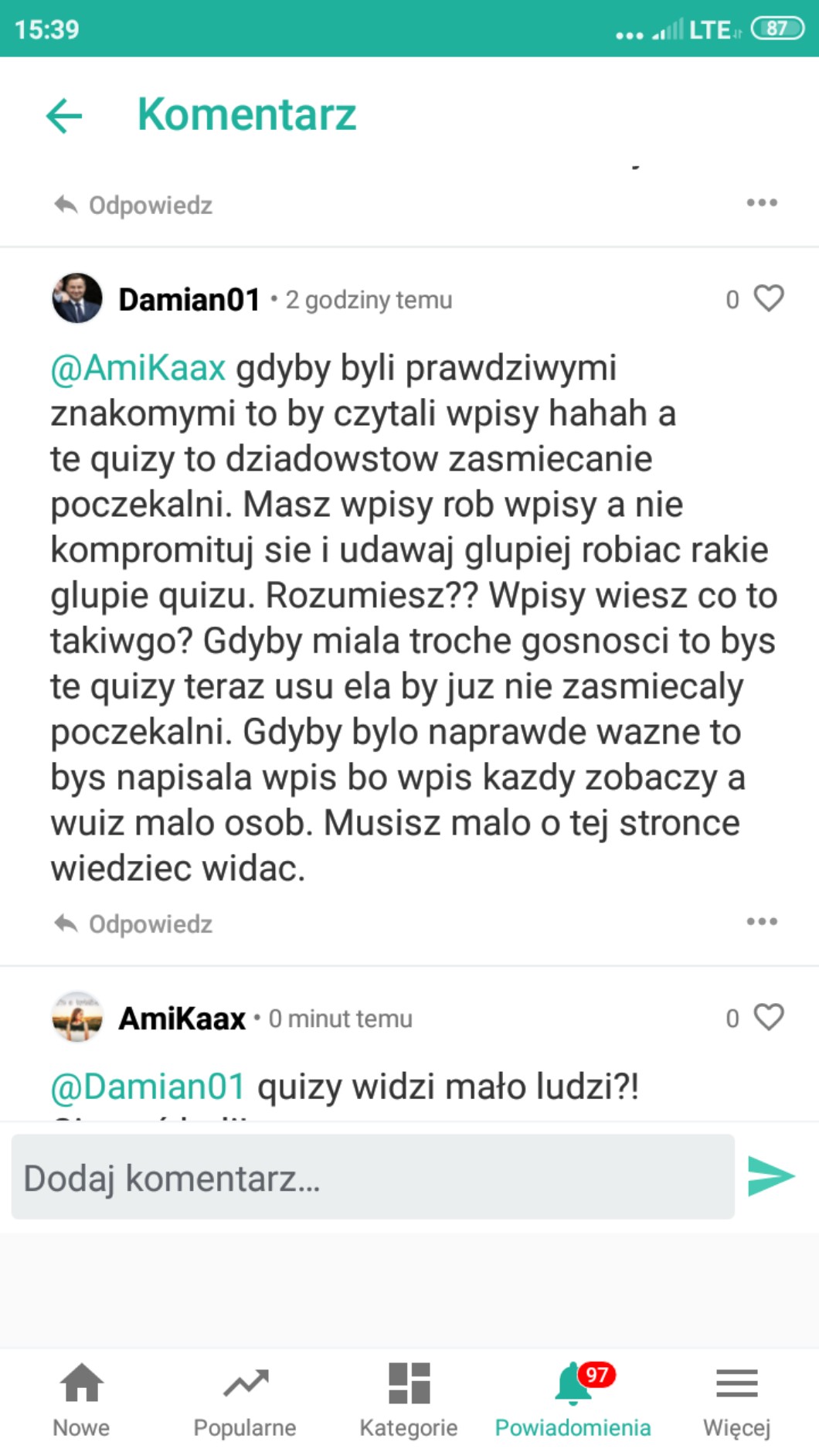 @AmiKaax jest besensu. Quizy prawie wszyscy obserwatorzy otwierają. A na wpisy raczej mało osób odpowiada