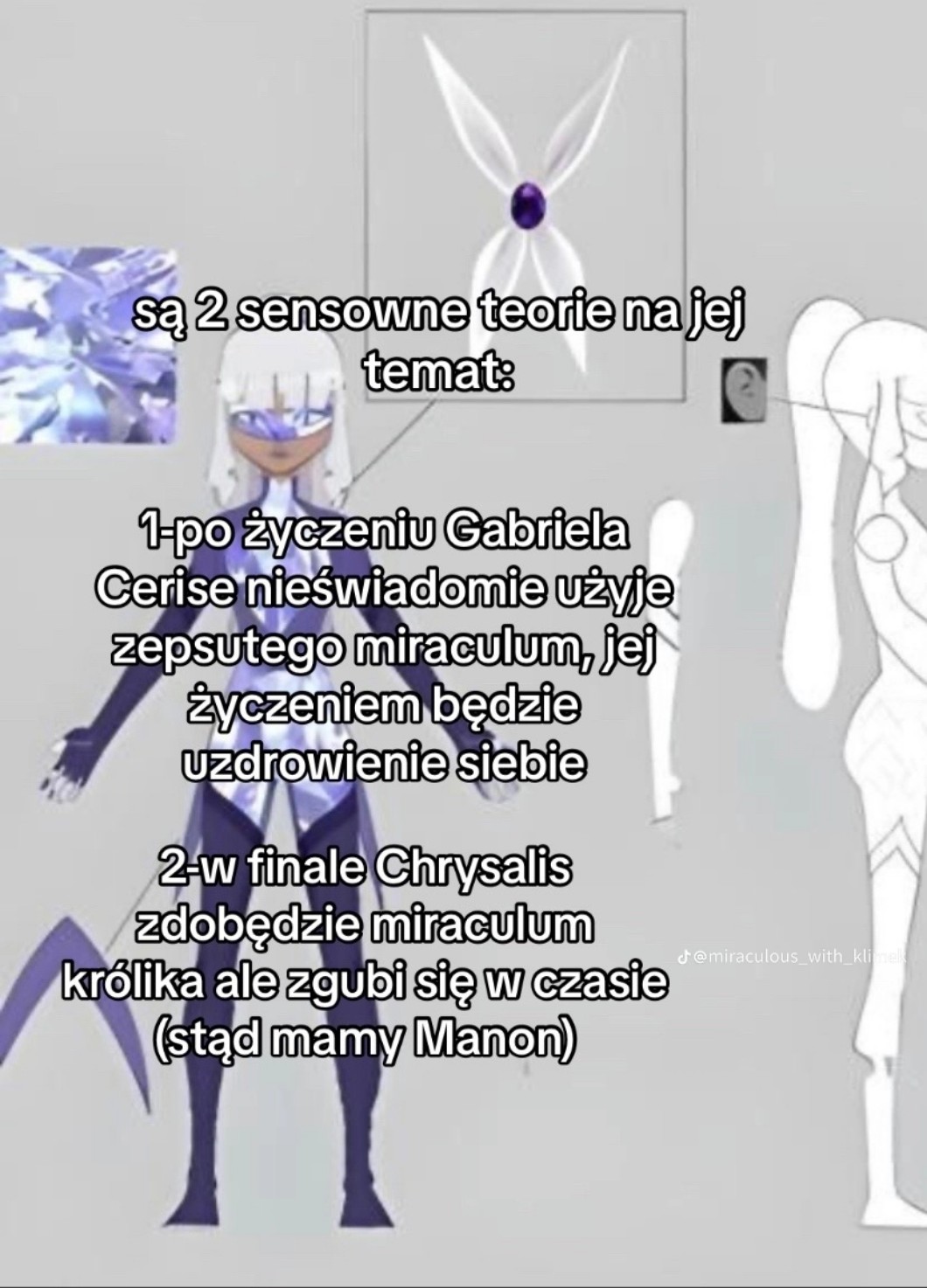 AUTOR•Miraculous od 4 sezonu nie jest dla dzieci. Złamane serca, poniżanie Czarnego Kota, stany depresyjne i ataki paniki Marinette, zawiłe i pokręcone wątki, śmierć Gabriela. Mózg dziecka by po prostu tego nie zrozumiał. Dobrze że jak byłam dzieckiem to Miraculous było dla dzieci i mogłam tak jakby dorastać razem z serialem. Słyszałam też że Rose jest na coś chora, chyba na raka. I jest też teoria (ta na zdjęciu), że Lila to tak naprawdę Manon tylko że zaginęła w czasie. *na zdjęciu jest imię i nazwisko Cerise Chrysalis, bo tak naprawdę nazywa się Lila*
