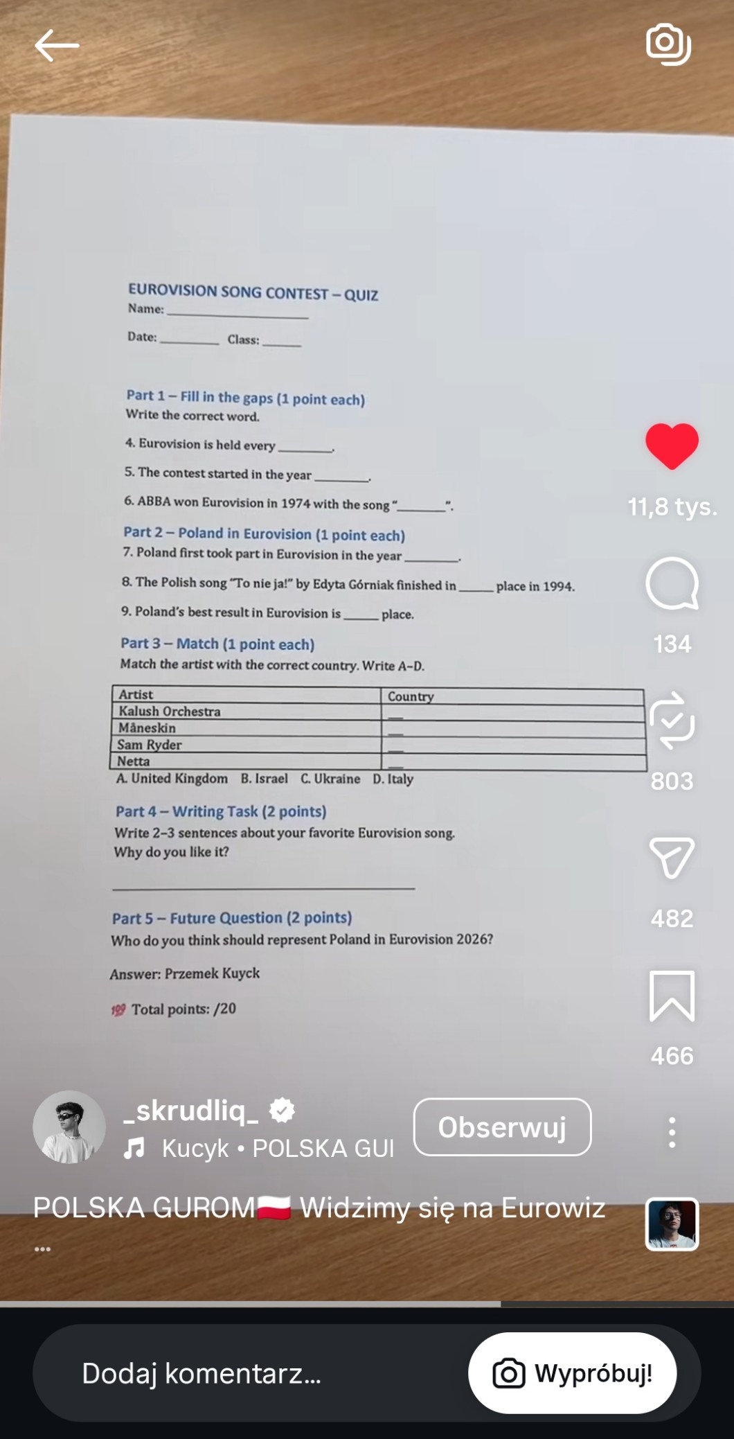 AUTOR•Ja bym chciał mieć takie eurowizyjne kartkówki w szkole 🙏.