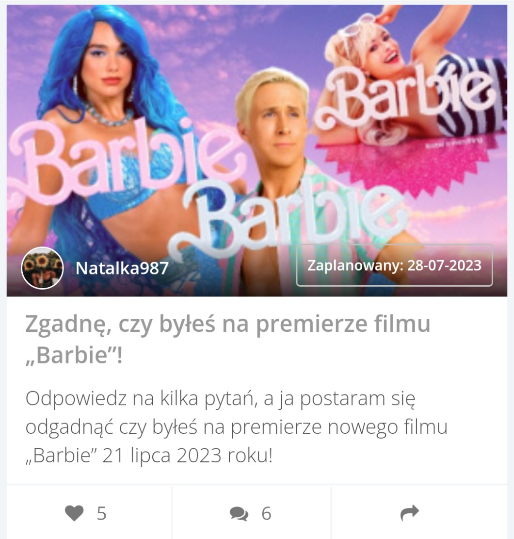 AUTOR•Kochani jeśli kiedykolwiek wątpiliście lub nie wierzycie, że quiz który ma mało serc nie ma szansy na Stronę Główną to zobaczcie sami, że nie warto się tym przejmować 💖 myślałam, że już nie oznaczą bo już po premierze "Barbie" ale zaskoczenie! 🍊