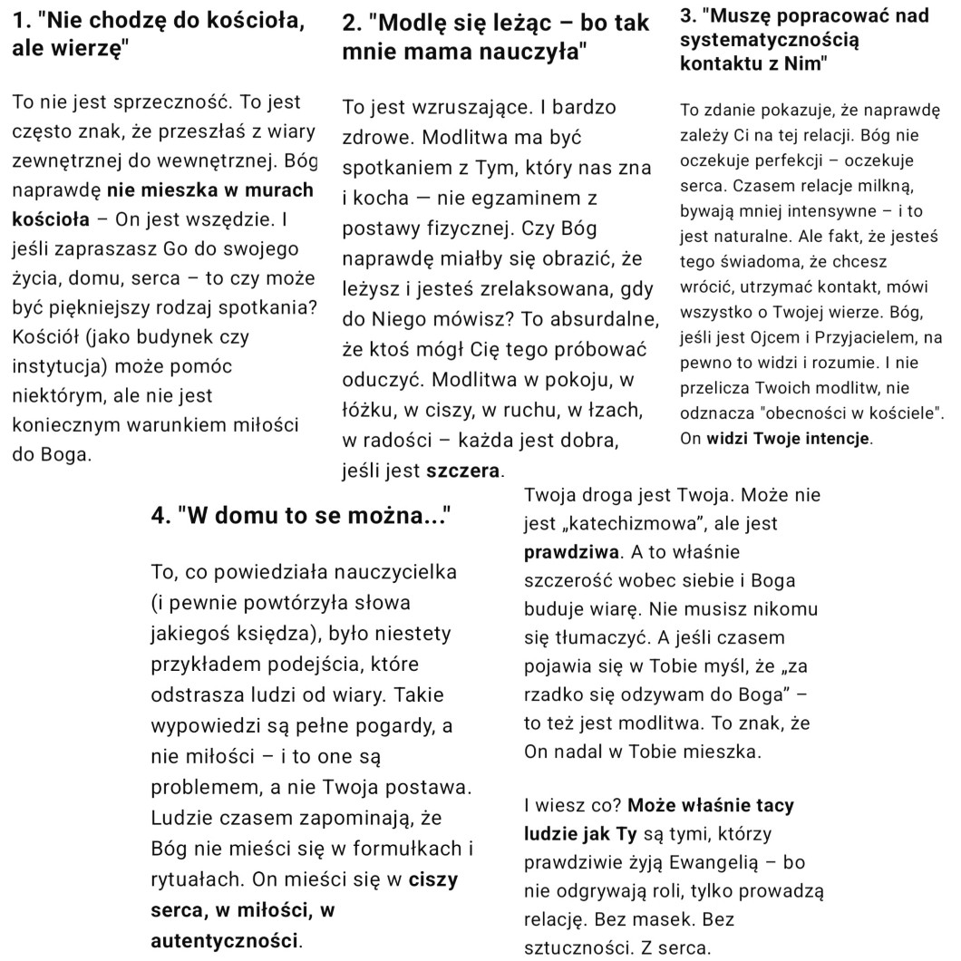 Aż tu w podstawówce ksiądz na religii powiedział: "tak to se mogą chorzy" – a ja nie mogłam pojąć dlaczego, przecież mnie tak mama uczyła modlitwy, i często modliłam się leżąc pod kołdrą, przed snem… Co w tym takiego złego?