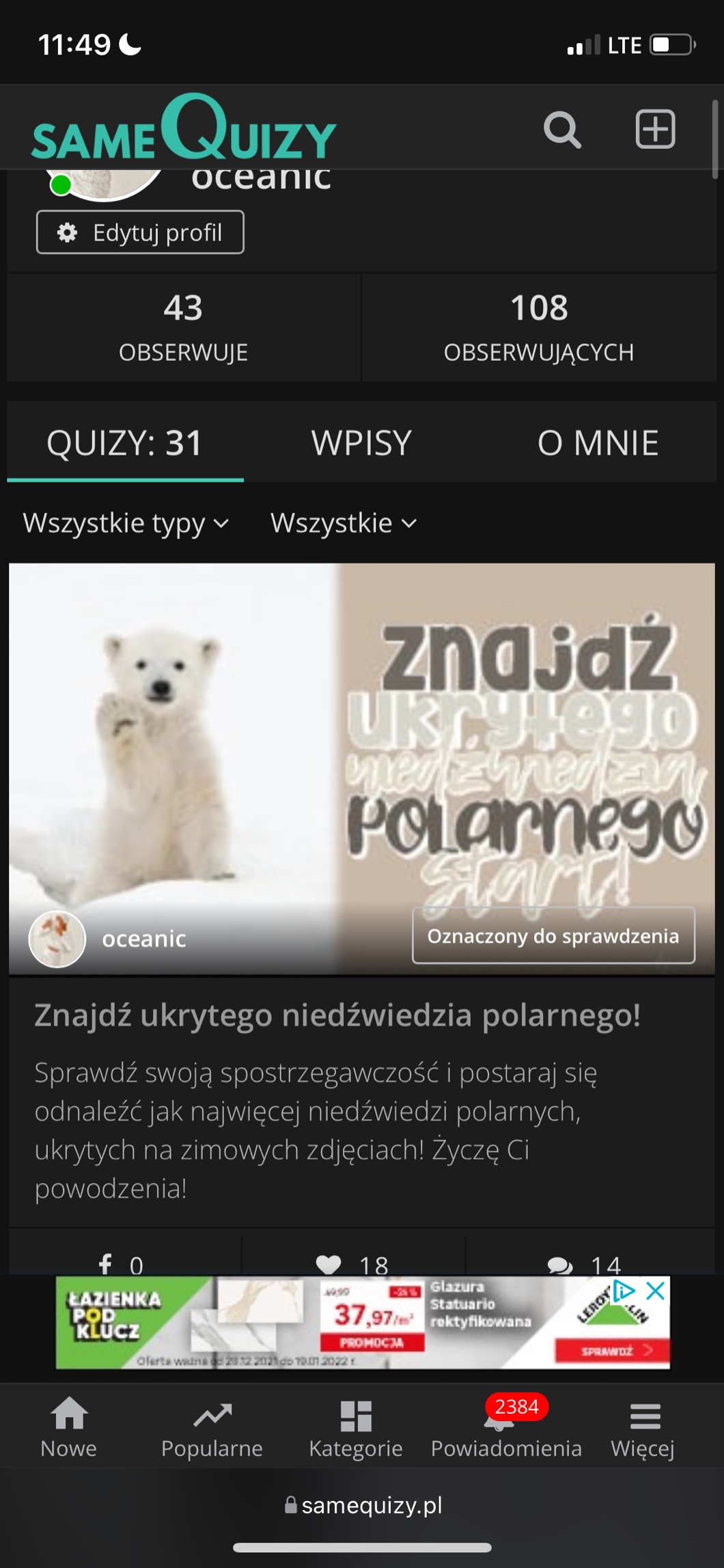 Ja nigdy nie miałam żadnego oznaczonego quizu 🐵