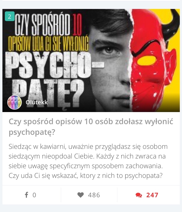 No, a wracając do profilu: słuchajcie, tak bardzo się cieszę, że tylu osobom spodobał się mój quiz o psychopatach! Coś niesamowitego. Prawie 500 polubień i jeszcze 2 miejsce w Popularnych w tym miesiącu. A do tego wszystkiego już ponad 300 obserwacji. Nie umiem ładnie podziękować, więc mam nadzieję, że to jedno słowo wystarczy. DZIĘKUJĘ 😍 jesteście kochani!