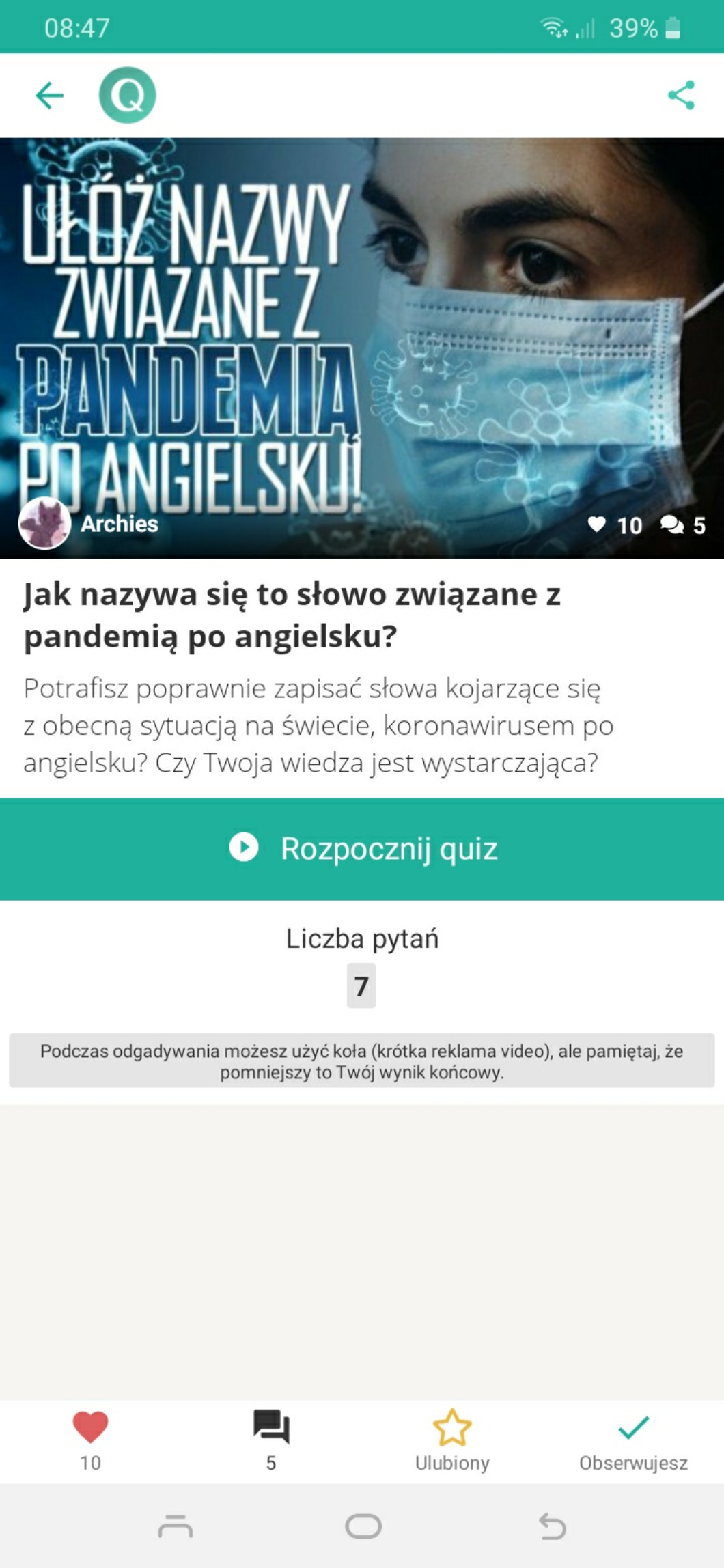 Zepsuło mi się coś, czy twój quiz na głównej ma 10 serc! Co tu się stało niby?! Jakby ktoś zrobił quiz czy rozpoznasz egzotyczne zwierzęta po angielsku, to by miało 70 serduszek, a w sumie tematyka Twojego quizu bardziej pasuje do obecnej sytuacji. Nie pytaj przejmuję się tym tak…(liczbą polubień)😅😂🤣