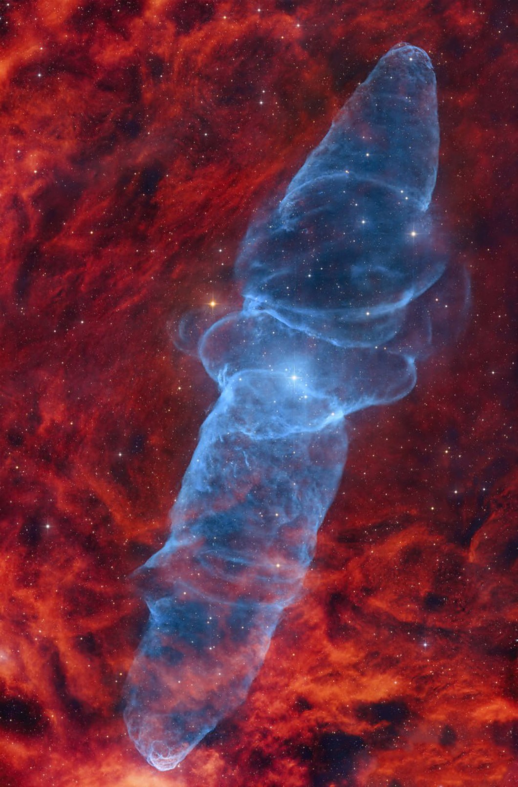 To jest czerwona mgławica wodoru SH2-129, otacza obszar aktywnego powstawania gwiazd. Wewnątrz ukryta jest Mgławica Wielka Kałamarnica (Ou4). W odróżnieniu od SH2-129 ma niebieski kolor na skutek promieniowania podwójnie zjonizowanego tlenu.