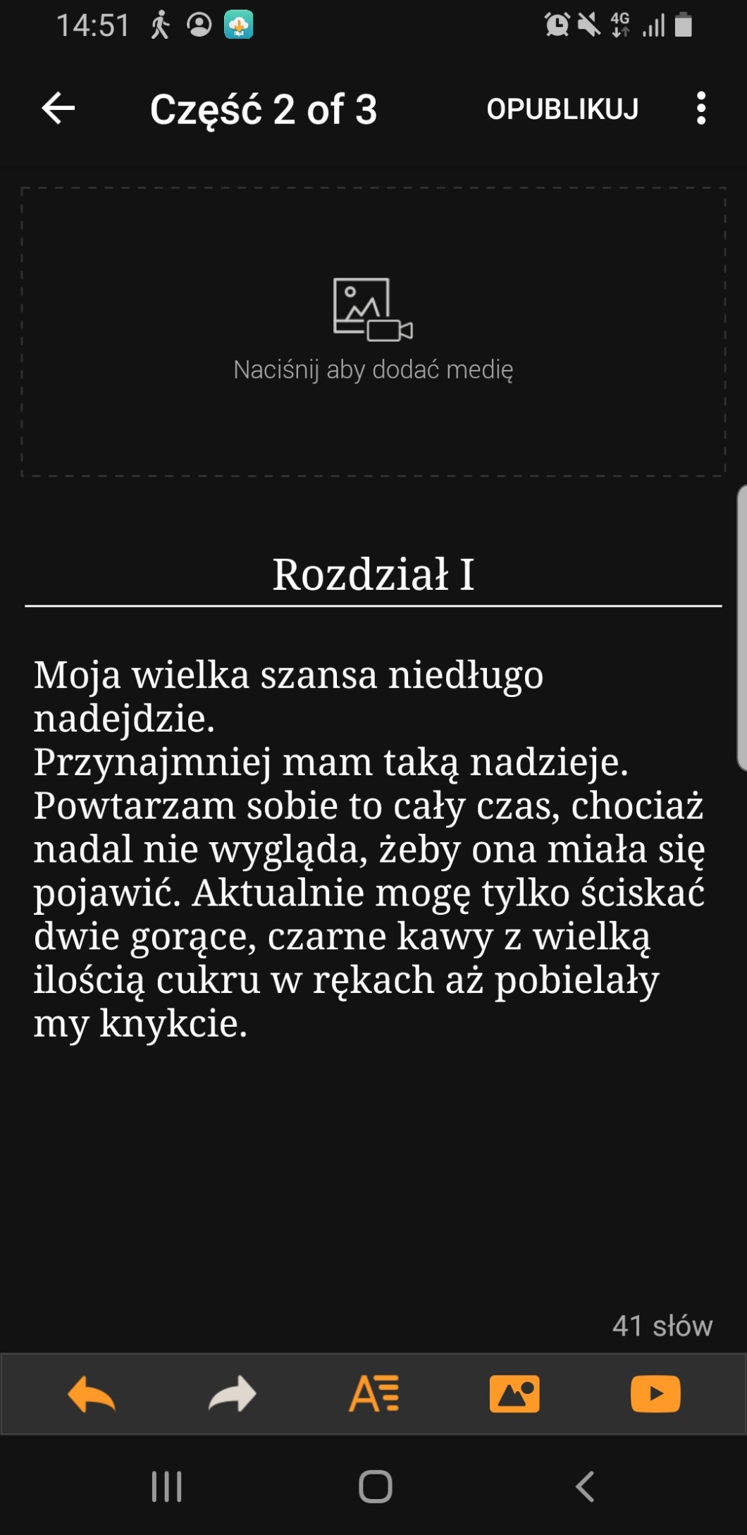 AUTOR•Źle mi z tym było, że pisałam tylko w moim życiu nie było fajnie, a teraz zwolniłam tempa z tym, bo wszystko nagle zaczęło być piękne. Dlatego to zmieniłam i chociaż to tylko kilka mizernych zdań to i tak jestem szczęśliwa jak małe dziecko, ponieważ zawsze wszystko zaczyna się od tych kilku pierwszych zdań.