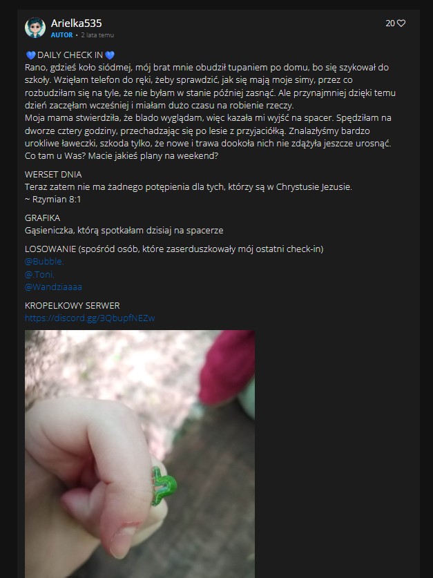 W związku z tym chyba wrócę do starego formatu check-inów – z wersetem dnia i grafiką. Nie musicie scrollować n lat świetlnych w przeszłość, wstawiłam screena pierwszego lepszego mojego wpisu, na którym widać, o co mi chodzi i który mieścił mi się na ekranie tak, żeby wygodnie mi było zrobić screna. Ktoś z Was pamięta mnie z tamtych czasów? Przyznać się!