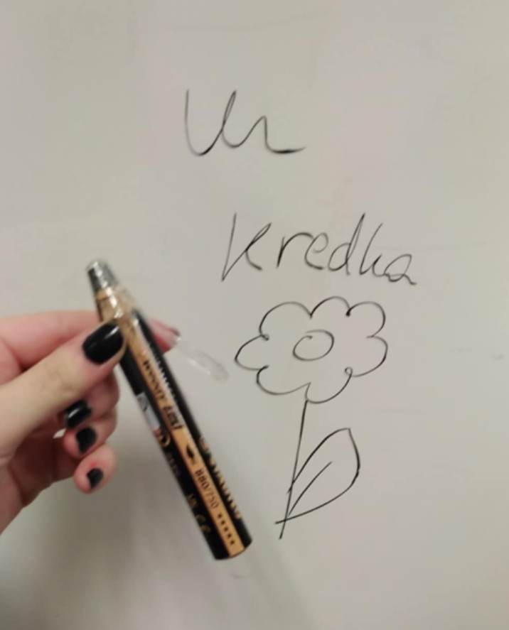 Na mój wydział ostatnio wkroczyły kredki do białych tablic. Dotychczas tylko słyszałam o nich plotki, a dziś po raz pierwszy miałam okazję użyć jednej z nich. Śmieszne doświadczenie. Narysowałam kwiatka.