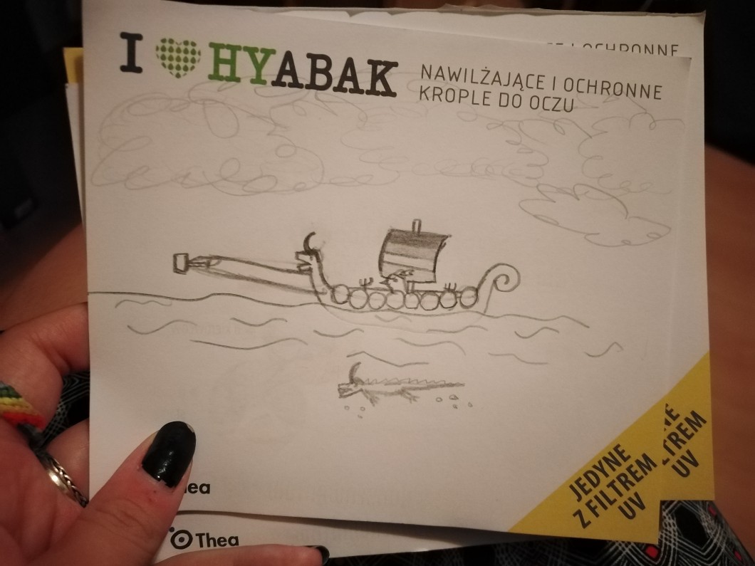 Następny rysunek, tym razem autorstwa mojej byłej. To "kaczka Thor na gejowym statku ciągniętym przez mjolnir".