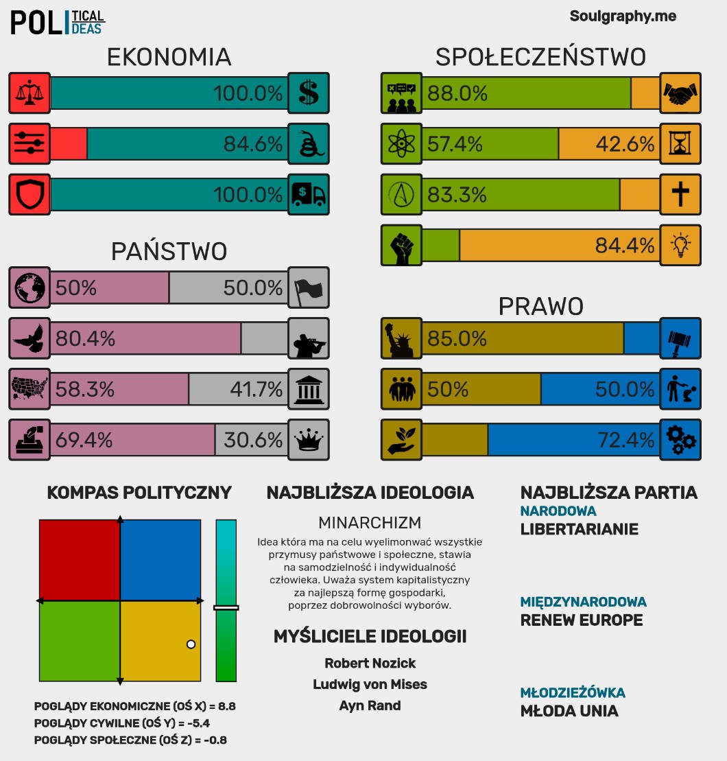 @Polscy_Patrioci W osi „społeczeństwo” jest pokazane, że popieram sekularyzm, ale to dlatego, że robiłem ten test kiedyś. Moje poglądy na ten temat się zmieniły, dlatego mimo, że jestem ateistą, to i tak uważam, że religia powinna być zachowana.