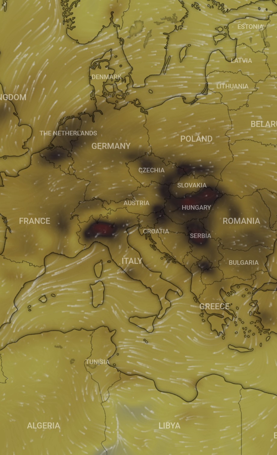 AUTOR•Mapa zanieczyszczeń tlenkiem węgla (czadem) w Europie Środkowej. Źródło: windy.com