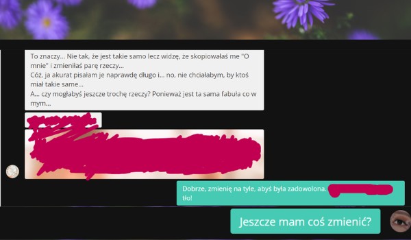 Pisałam pewnego dnia z @dreamily (Chcę żebyś to przeczytała!). Mianowicie, zapytałam się jej, czy mogłabym mieć "o mnie" te same co ona, tylko zmienię kilka rzeczy. Pokazałam jej wersję końcową. Nie zgodziła się. No więc, postanowiłam jeszcze coś zmienić. Zapytałam się: "Jeszcze mam coś zmienić?". Nie odpisała mi na to pytanie. Pomyślałam, że się zgadza (Lecz źle myślałam) i dodałam "o mnie" na profil. Sprawa nie jest do dzisiaj wyjaśniona, więc właśnie to robię. Uznałam, że zachowywałam się źle, bo wiedziałam, że się nie zgadza i po prostu, brzydko mówiąc, jestem hamska i nie miła. Chcę Cię przeprosić @dreamily! Naprawdę, zachowywałam się źle. Powinnam od początku wiedzieć, że ty po prostu się nie zgadzasz. Teraz do moich obserwatorów: Postaram się w weekend napisać "o mnie" od nowa własnymi słowami. Wydaje mi się, że chyba lepiej zrobić to później, a pisać samemu, nic zrobić to wcześniej, i żeby inny użytkownik to pisał. Jeszcze z całego serca chcę przeprosić @dreamily!