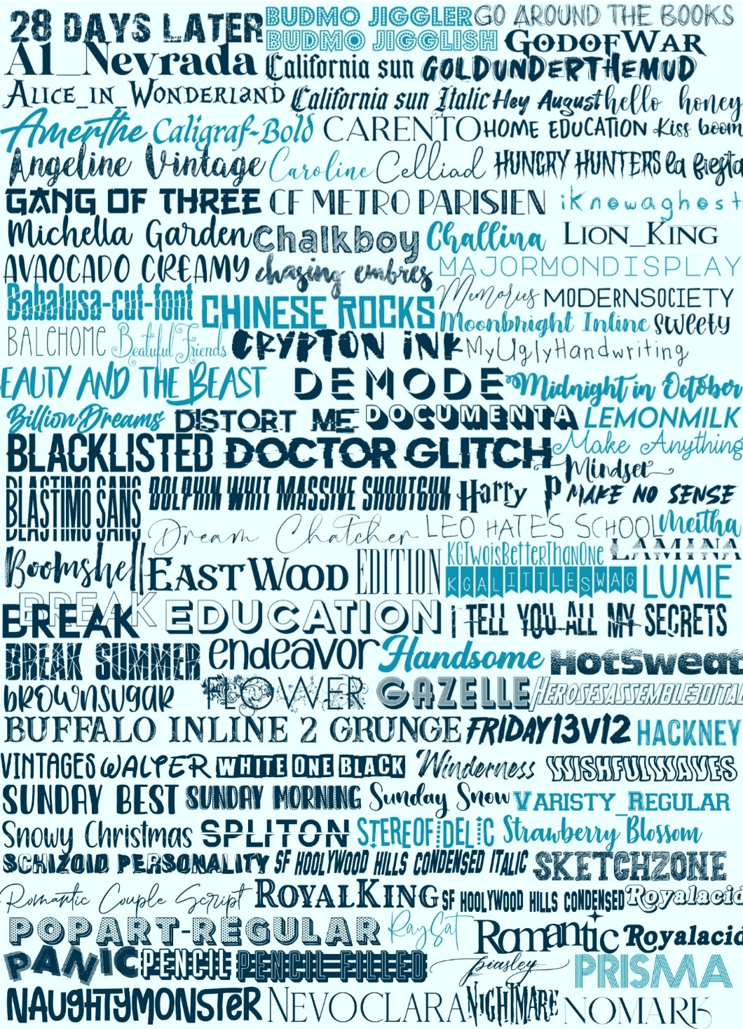 • Postanowiłam sobie ściągnąć tylko kilka fontów, ale wyszło dużo więcej xD takim oto sposobem postanowiłam zrobić małe porządki z nimi, czyli usunęłam te które przestały mi się podobać, żadko ich używam lub sa mega podobne. Oczywiście mało usunęłam bo jeszcze nic nie mogę powiedzieć o nowych. Postanowiłam wszystkie pokazać e jednym miejscu i proszę jeżeli kogoś ciekawi jakie mam fonty to zdjęcie na dole. Nie spodziewałam się że jest ich aż tak dużo xD a no i te na jasno niebiesko maja polskie znaki.
