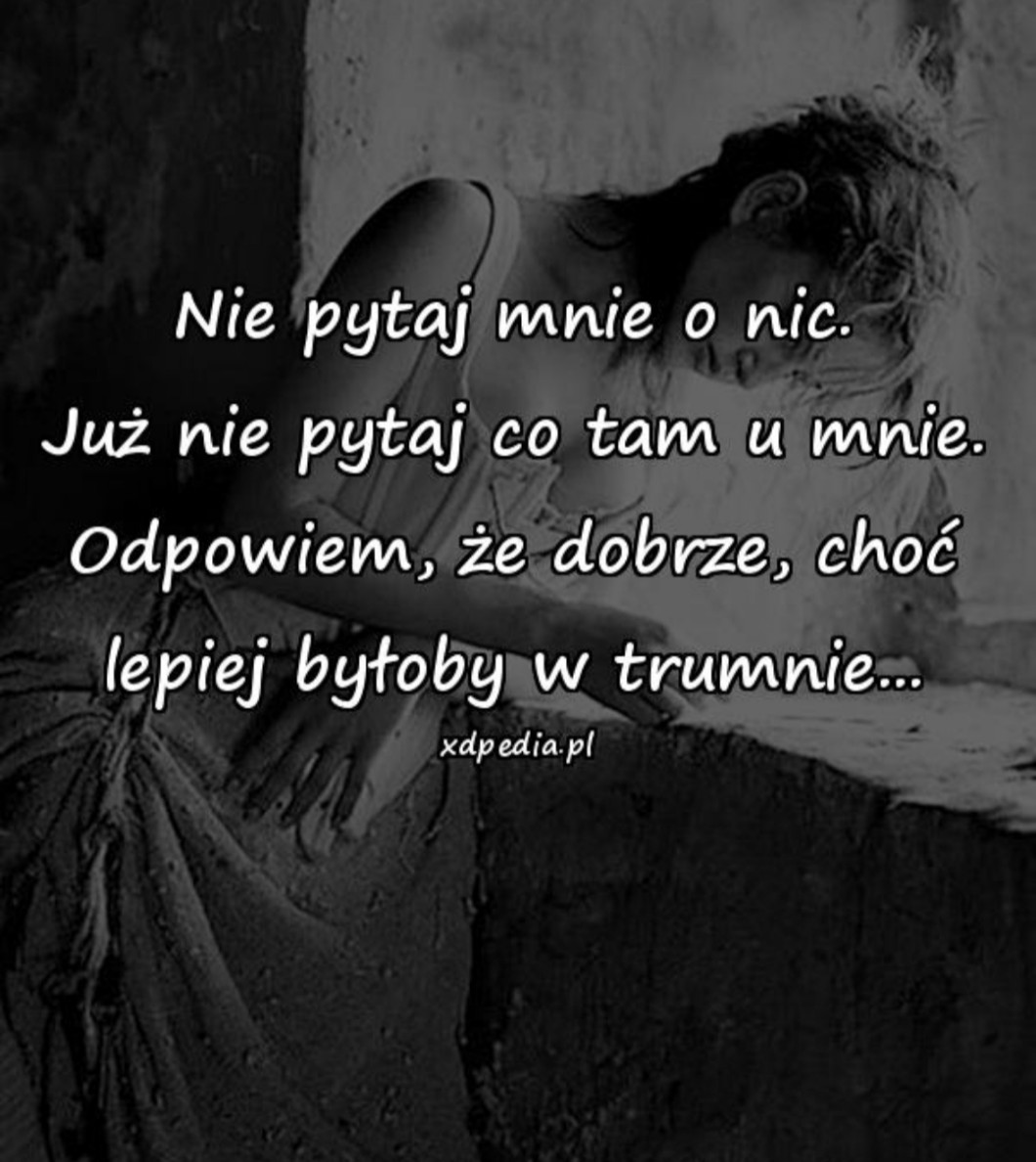 AUTOR•No dobrze. Odwa*am się z waszego życia. Teraz jestem w samotności. Niech nikt tego nie serduszkuje. Niech nie pisze powiadomienia pod tym wpisem. Możecie to przeczytac ale nie komentować ani serduszkować… nie usuwam się z całego SQ. Ale usuwam sie z waszego życia. Nic tu nie róbcie. Przeczytacie to i koniec. Możecie mnie nawet ignorować. Przecierz jestem nic nie warta. Jestem wrażliwa to prawda… ale nic warta. Nic nie róbcie. Nic. Dziś się już chyba nie zobaczymy…….. pa.