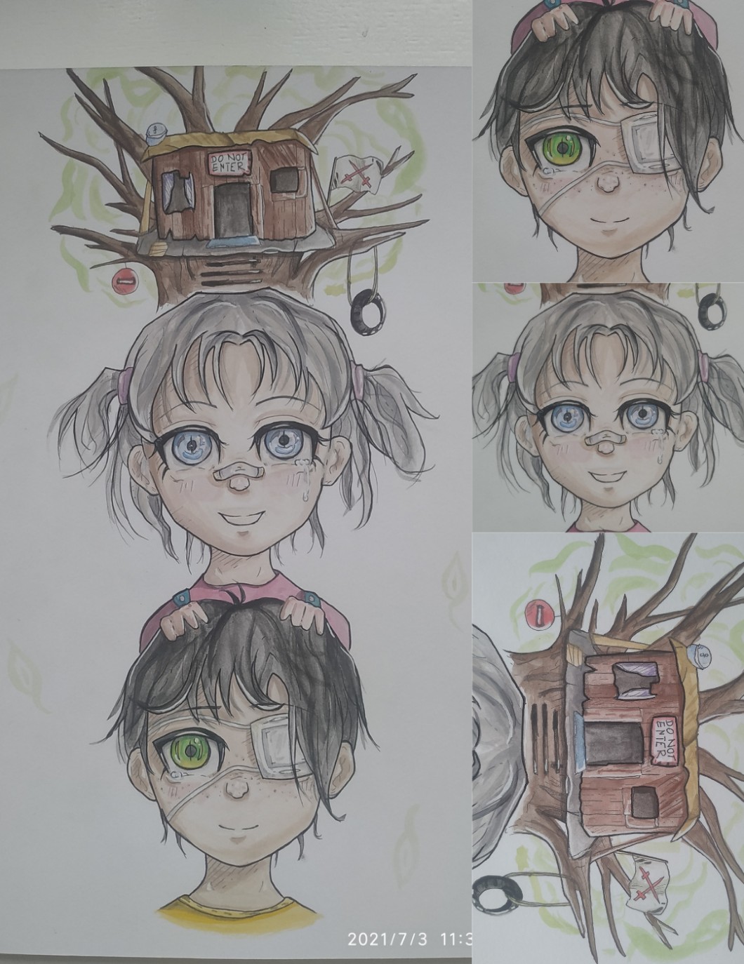 ‼️🦋‼️ To teraz coś luźniejszego i jednocześnie najważniejsza część tego wpisu. W bodajże poprzednim wpisie wspominałam o chęci podzielenia się z Wami moimi pracami, dlatego teraz to zrobię. Rysunek, którego zdjęcie znajdziecie poniżej (z góry przepraszam za jakość, bo na sQ się ona nieco pogarsza), wykonałam farbami akwarelowymi (moja trzecia praca nimi) oraz czarnym cienkopisem Mikron. Uprzedzam, nie jest to mój stały styl rysowniczy, ponieważ normalnie nie rysuję ani tak dużych oczu, ani dzieci, lecz nieziemsko zainspirowała mnie piosenka Treehouse – alex g (link do nutki https://youtu.be/QNNpUTeLfec polecam!), dlatego też takową pracę stworzyłam. Obie postacie są w pełni wymyślone prze mnie. Chyba powtarzam wyraz "praca", ale pomińmy ten fakt hah 😅 Zaznaczę ponownie – trzeci raz w życiu używam farb akwarelowych, w żadnym wypadku nie jestem ekspertką w tym temacie, ale bardzo chciałabym usłyszeć wasze zdanie na temat tej ilustracji. Jedyne o co proszę to szczerość i ewentualnie dobre rady od osób znających się na farbach. Mnie osobiście się ona w miarę podoba, ale z perspektywy czasu (dwóch dni xD) uważam, że z kilku elementów nie jestem zadowolona.
