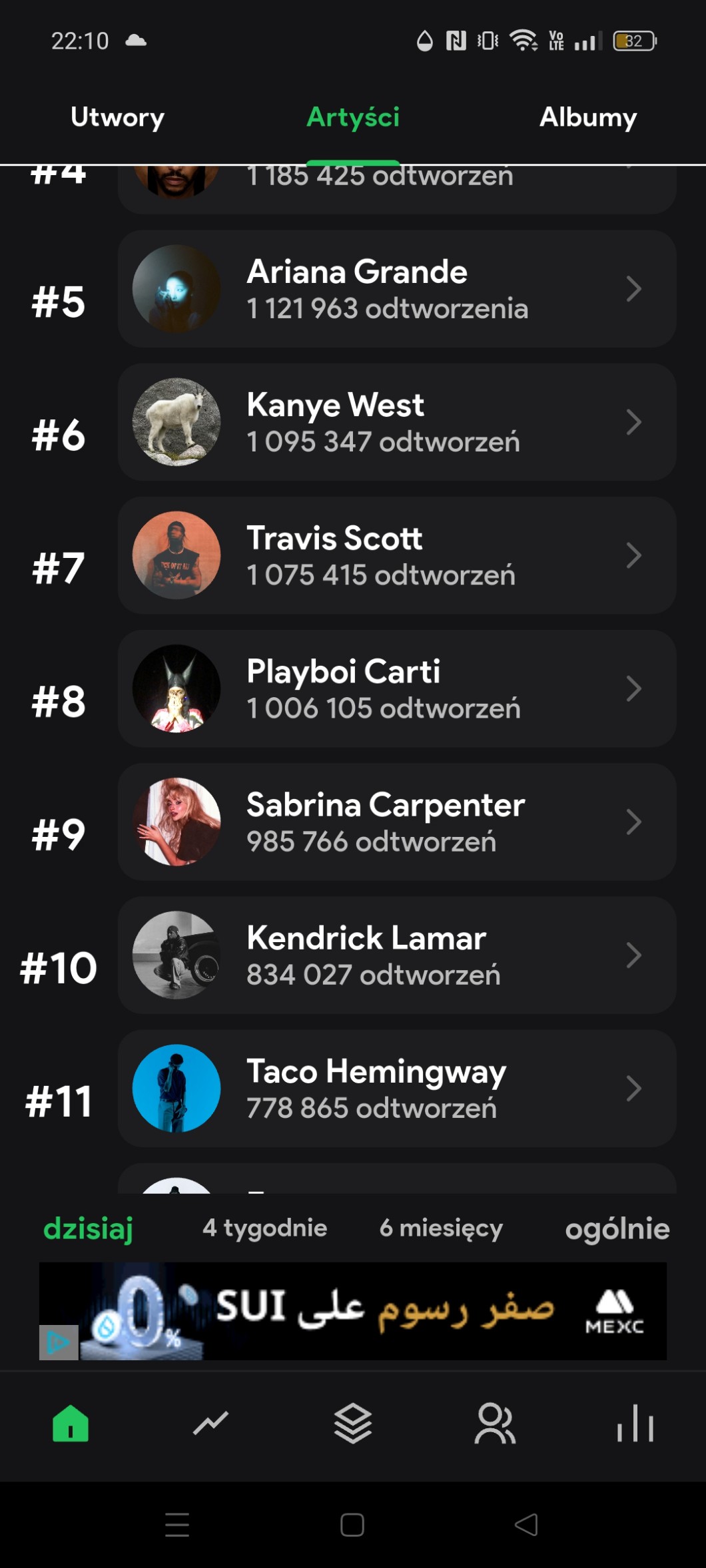 Future,Billie eilish, Mac millera , Queen, the Beatles, Radiohead, tyler the creator,Lane del ray ,BTS,Rihanne,justina Biebera,juica wrlda,linkin park, lady Gage,Arctic monkeys,Olvie rodrigo, Stray kids i wielu innych