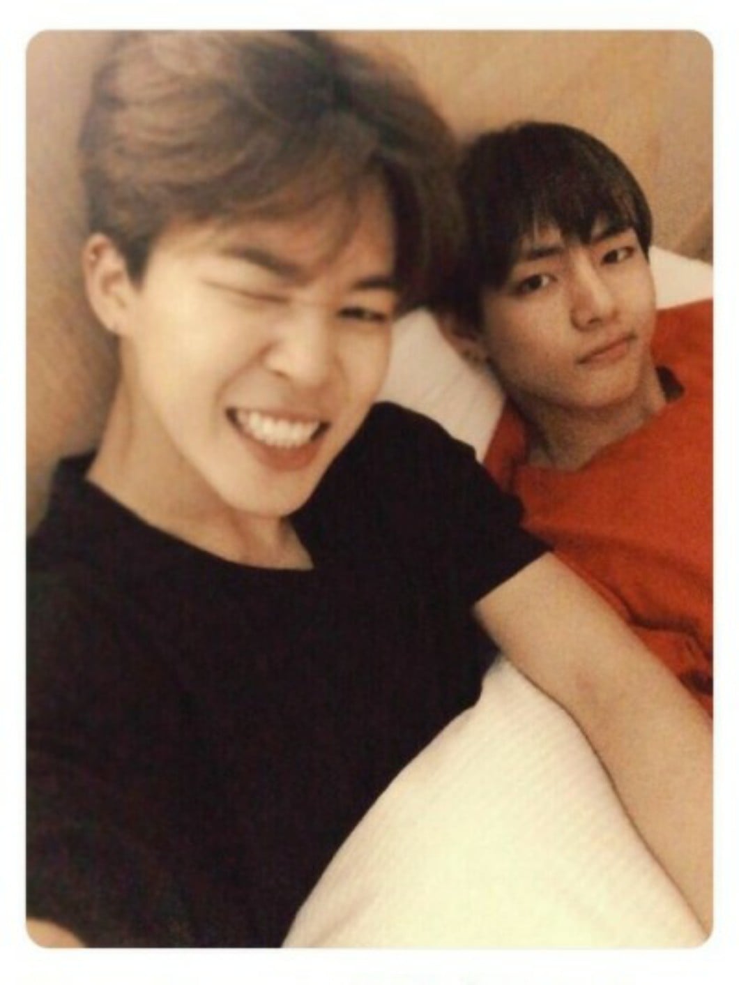 Dzień 1: Zacznijmy od Tae i Jimina, zatem poniżej macie jak razem w łóżku siedzą (Sanki, te opisy będą okropne i ja to wiem)