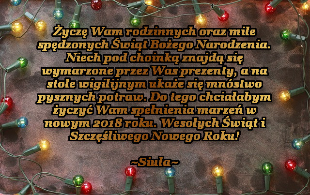 Chcę Wam życzyć na pewno miłych i rodzinnych świąt, które zapadną Wam w pamięć. Oczywiście w dobrym sensie. Mam nadzieję, że jutro pod Waszą choinką zobaczycie swoje wymarzone prezenty. Oby wszystkie wigilijne potrawy Wam smakowały, a ten kto lubi, by najadł się bezwstydnie opłatka. Co ja nawet robię 😂 Do tego spełnienia marzeń w Nowym 2018 roku. A ogólnie Wesołych Świąt!