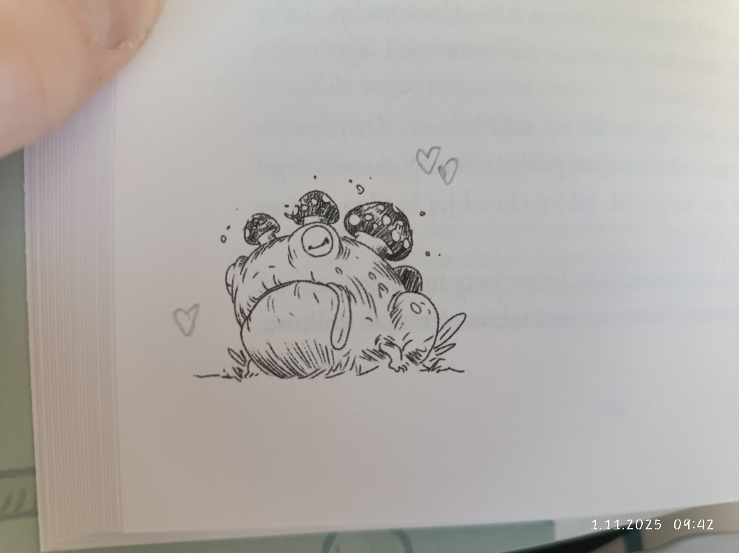 Na dole macie mega mega mega uroczy rysunek żaby w czytanej przeze mnie książce teraz