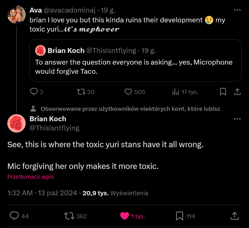 Also teraz dodaję (bo w trakcie oglądania finału byłem bardziej zajęty martwieniem się o to, kto przeżyję, niż zajmowanie się jakimś shipem): Ich scena (tacomic) była o wiele za krótka i uhhh, oczekiwałem czegoś głębszego (i bardziej emocjonalnego), ale uhhh i tak mam na tle, bo Taco jest taka duża w porównaniu z głową Mic i to jest funny, do widzenia