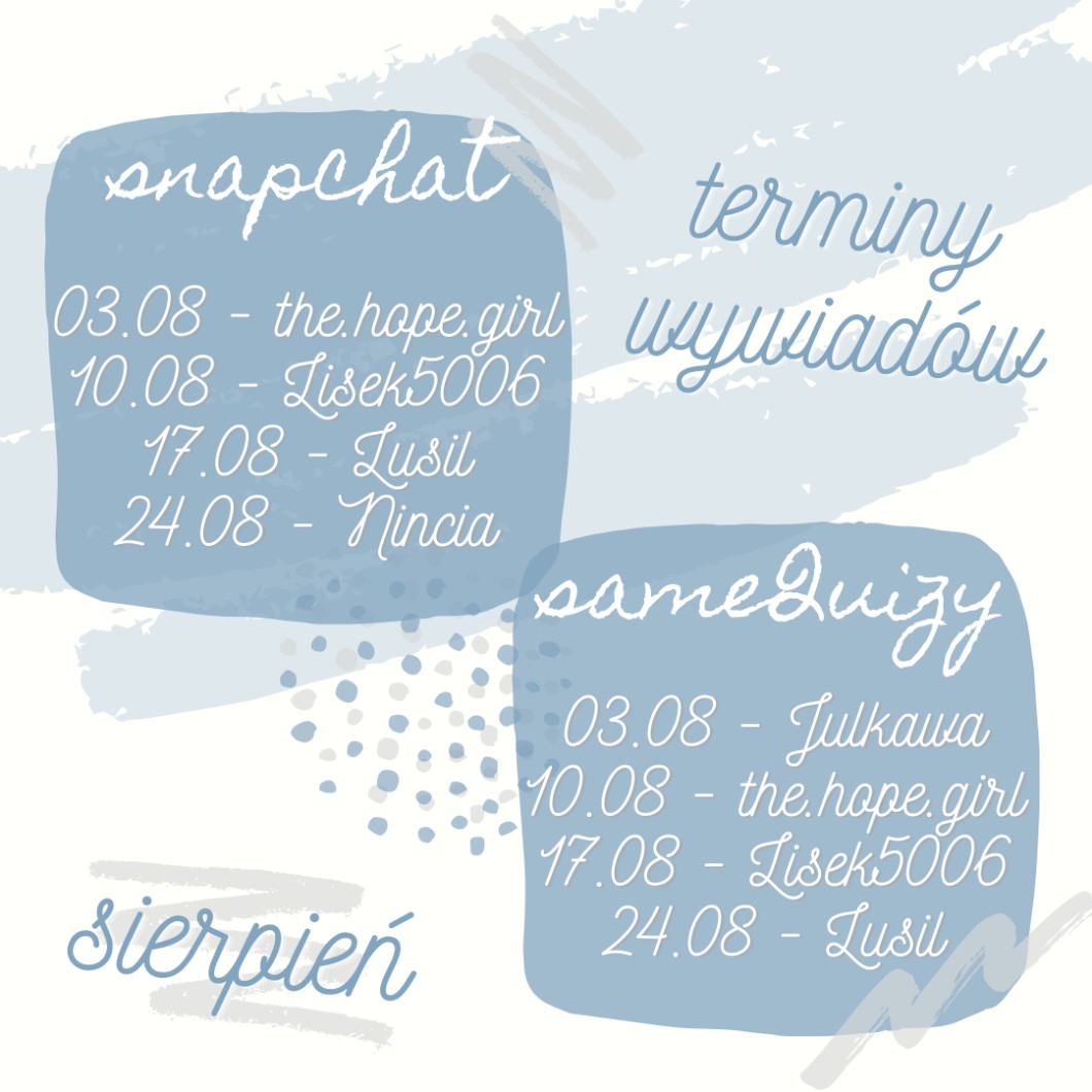 Dzisiaj o północy zakończyliśmy zapisy zarówno do wywiadów, jak i DZŻQ. Informujemy, że nowe zapisy nie ruszą szybciej, niż w przyszłym roku. Dziękujemy, że wciąż jest tak wielu chętnych i tak pozytywny odbiór z Waszej strony, ponieważ dzięki temu napędzacie nas do dalszej pracy. Prosimy wszystkich użytkowników, którzy są zapisani, aby nas informowali o zmianie nazwy profilu, planowanej przerwie, która może wybić z rankingu oraz odejściu, ponieważ bardzo nam to ułatwi sprawę. Niżej podrzucamy Wam terminy na sierpień i mamy nadzieję, że wywiady Wam się spodobają.