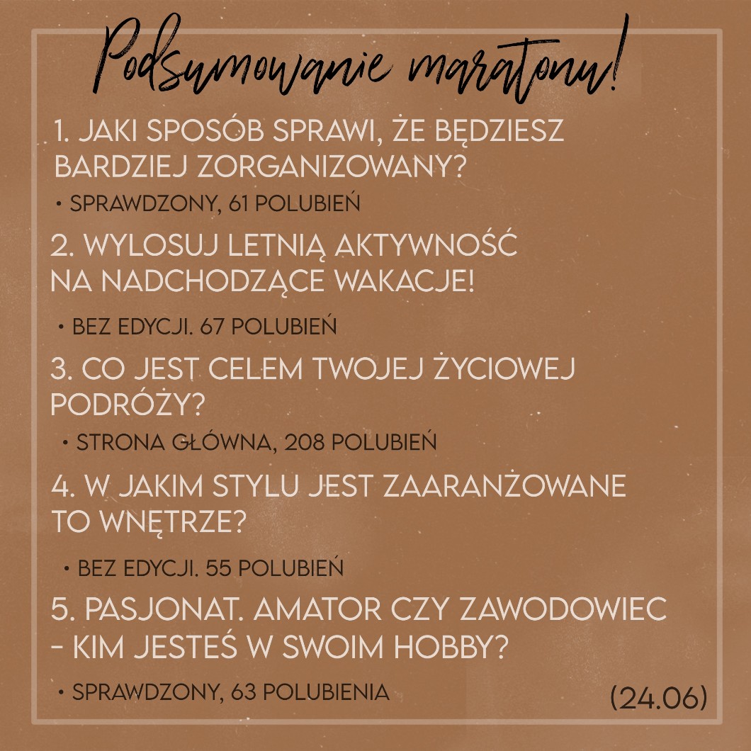 🌻 Bardzo wam dziękuję za miły odbiór moich quizów z maratonu, bo trochę się stresowałam z powodu ich szybkiego wystawiania codziennie. Zawsze Quizy robię w jakimś odstępie czasowym, a w trakcie maratonu takiego odstępu nie ma, hah.