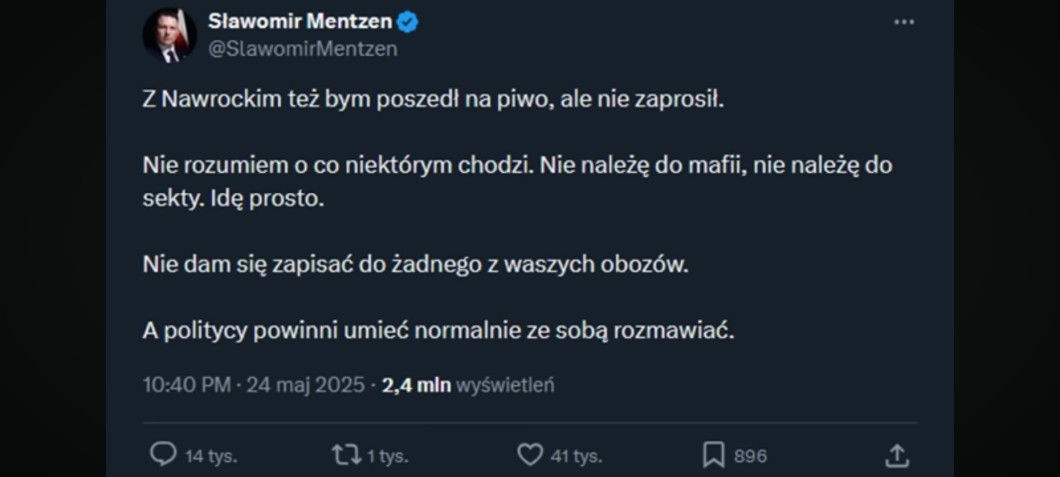 Moja pierwsza reakcja: Mentzen ma u mnie plus, nawiązanie do piosenki Kultu. Słowa „Nie należę do partii, nie należę do sekty” są wyjęte dosłownie z utworu „Prosto”