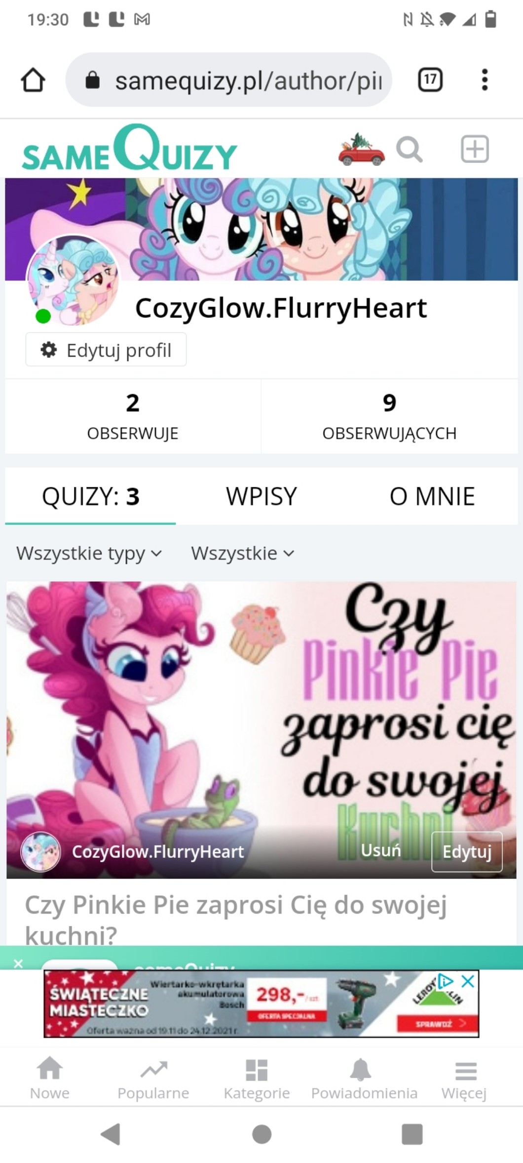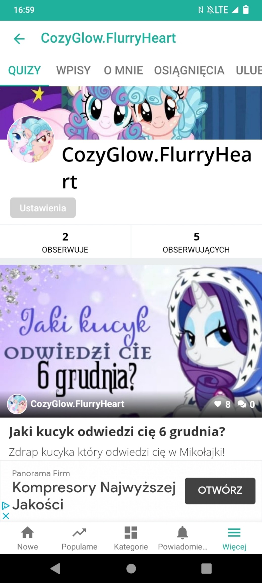 Quiz https://samequizy.pl/jaki-kucyk-odwiedzi-cie-6-grudnia/ ma 16 serc i bardzo chce żeby dostał się na SG. Jest on stworzony na koncie @CozyGlow.FlurryHeart o którym zapewne słyszeliście jak patrzyliscie na moje wpisy :)