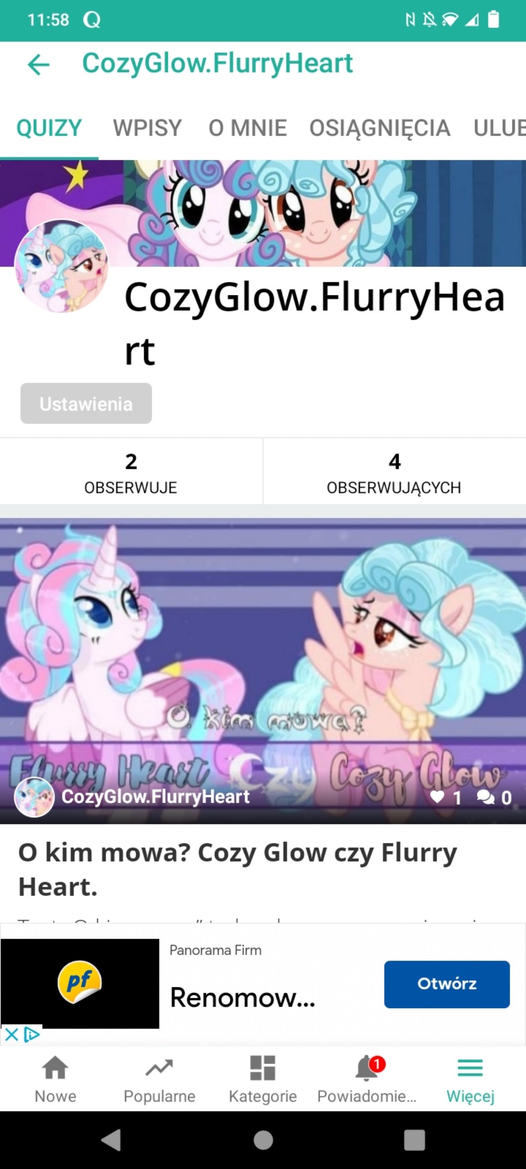 AUTOR•Właśnie @.Cetlin. dodała nowy quiz na @CozyGlow.FlurryHeart Robiła miniaturkę i wszystko inne, ale ja napisał tylko opis pod wylosowanym kucykiem.