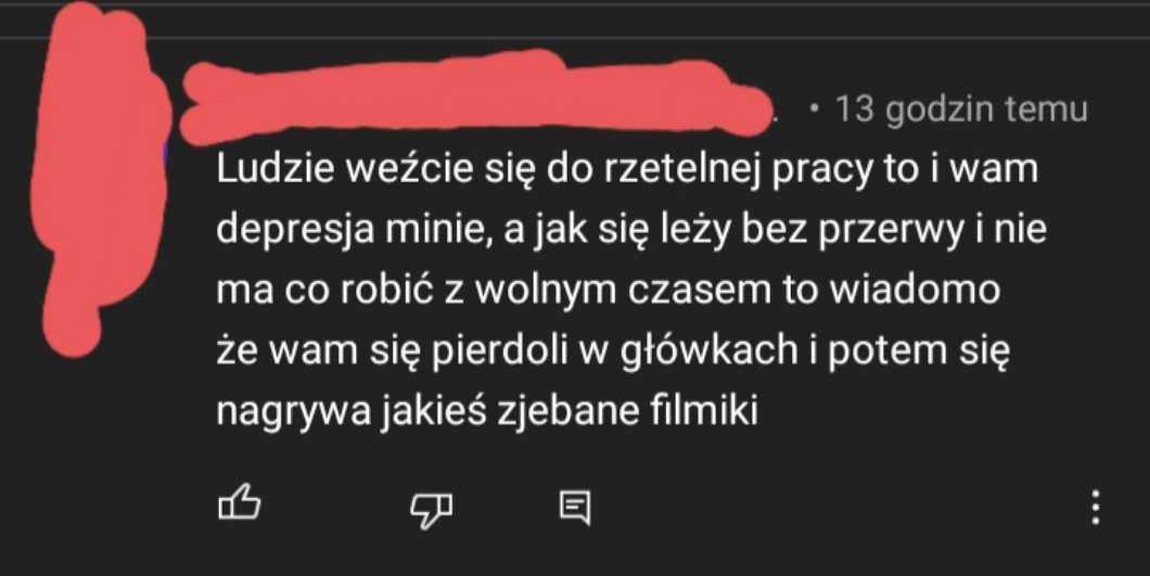 @ahayn. Szkoda gadać… Chyba ktoś ma ból d*** i nie rozumie zupełnie tematu. Najpewniej sam ma dużo w życiu na głowie, nie miał styczności z osobami chorymi na depresję (ani inne schorzenia psychiczne) i uważa, że jest to niby wymówka osób leniwych. Chore, ale niestety ludzie serio czasem są tak mega głusi na informacje i uparci przy swoich bardzo prostych tezach.