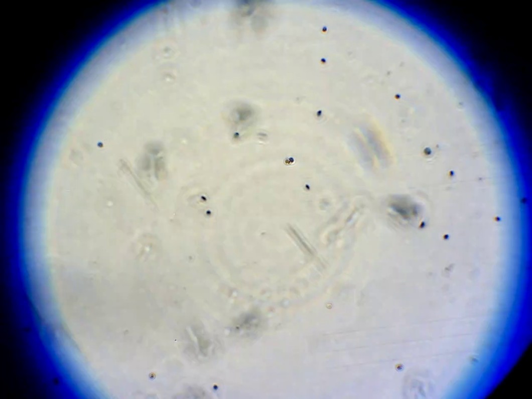 A to jest złota alga pod mikroskopem. Na żywo jest fajniejsza, bo jeśli jest akurat żywa, to sobie pływa i niektóre się nawet kręcą w kółko. Dla porównania, sinice które nadal liczę wyglądają jak obcięte włosy.